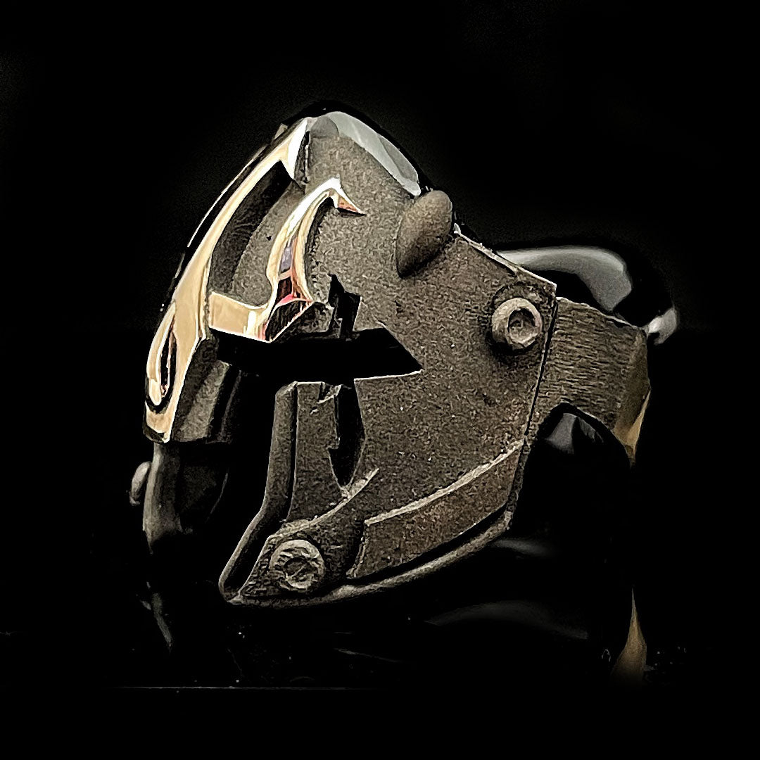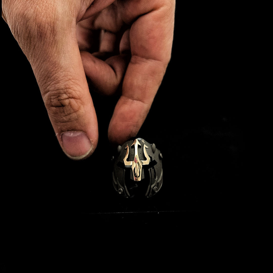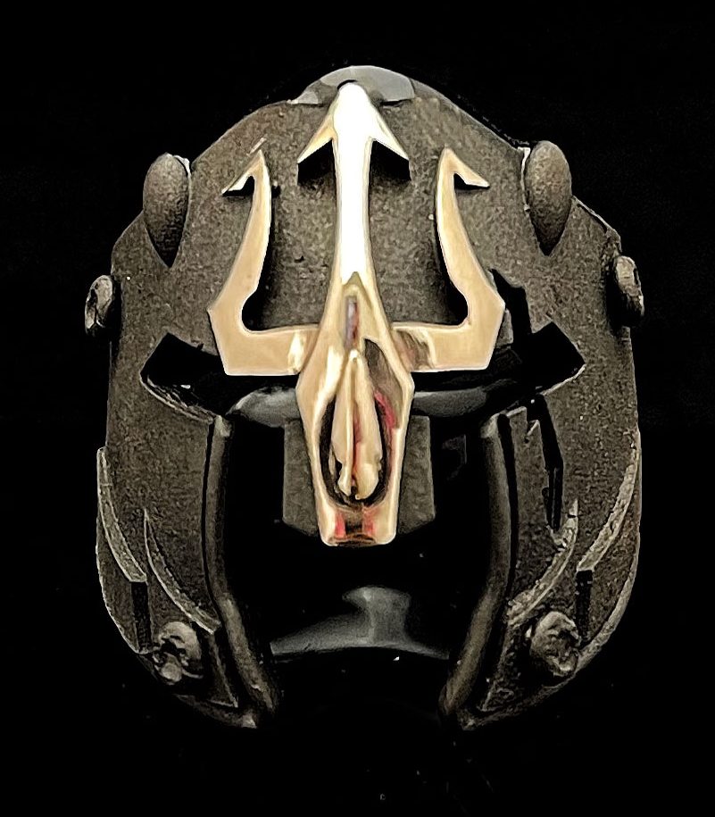 Anello speciale Poseidone delle profondità è stato fortemente voluto dalla community "SpartanRing". Un esemplare fantastico di anello costruito in diversi materiali e rifiniture. Il gioiello raffigura l'elmo armatura dei guerrieri di Poseidone. L'effetto opaco e il tridente lucido crea un contrasto spettacolare. Questo custom è un altro esempio di Gioielleria unica al mondo, dal confort insuperabile, pura arte Made in Italy.