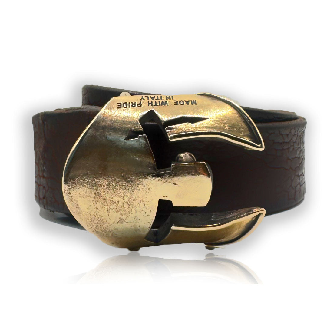 La fibbia, scolpita con linee nette e potenti, unisce forza e stile in un’unica firma visiva: riflessi caldi, dettagli vivi e una finitura “vissuta” che racconta carattere, come un’armatura moderna. Il bronzo anticato dona profondità e anima al metallo, mentre la lucidatura ne esalta i contrasti, creando un effetto luxury deciso e maschile.