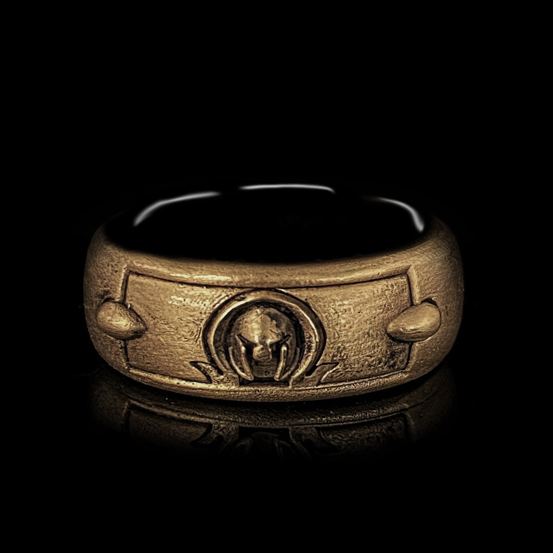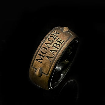 Remember who we were, so he told me… Memory is a very powerful form of energy, remembering gives us the power to reflect, understand. On the monumental tomb of King Leonidas there is a very famous writing engraved in ancient Greek: : ΜΟΛΩΝ ΛΑΒΕ , which translated means: Come and get them. This phrase was the response that King Leonidas gave to a high-ranking Persian military officer, when asked to lay down his arms and surrender. The great pride he gave his people still resonates today. Since then we have been given great teachings by the Greeks. Here with this Bronze and Enamel band completely embossed both internally and externally, we can always carry this memory with us. A ring of incredible craftsmanship, unique, as only the designer Giuseppe donated, taught us to appreciate. Inside we find an elaborate finish carved into cubes, and both sides engraved and embossed with both the ancient Greek writing and the company logo. A unique ring to absolutely have to complete your Spartan style. Excellent combination to associate with other rings.