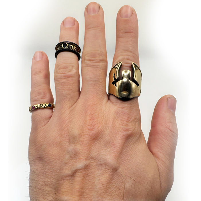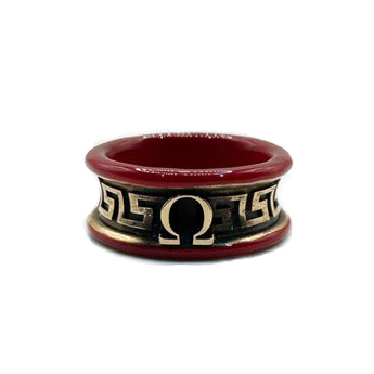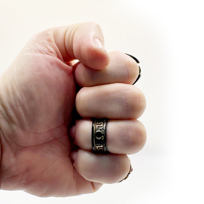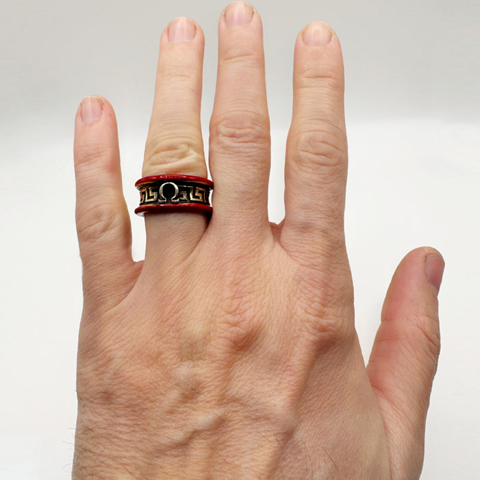 Questo anello in bronzo nasce come una cintura di forza: una fascia pulita, scolpita con una greca senza tempo e il simbolo Ω inciso a mano, emblema dell’ultimo passo… e del nuovo inizio.