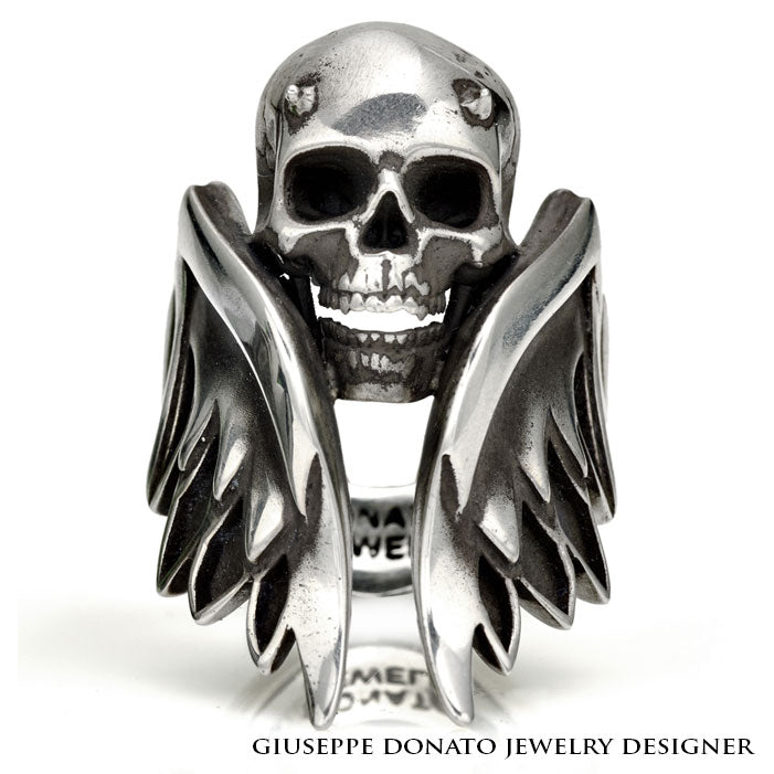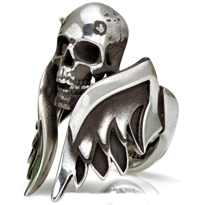 due ali scolpite con precisione, affilate come lame, avvolgono il metallo in un abbraccio oscuro e affascinante.