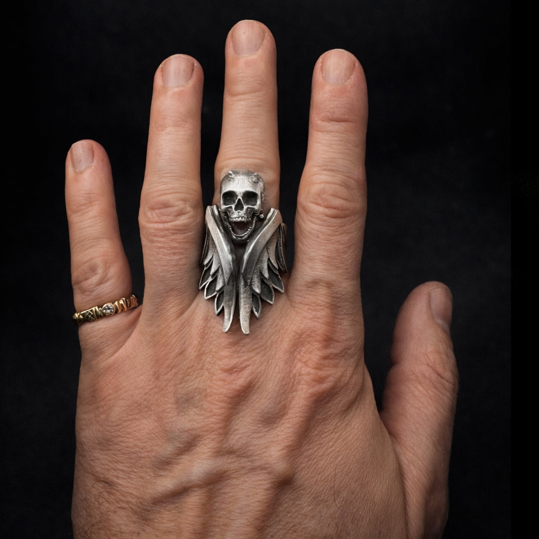 due ali scolpite con precisione, affilate come lame, avvolgono il metallo in un abbraccio oscuro e affascinante.