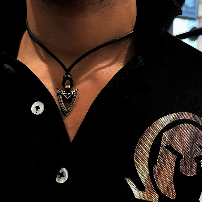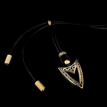 The arrowhead pendant is inspired by the sacred relic of Artemis. His magic bow had magical arrows in its quiver that always hit the mark. engraved on it in ancient Greek his magic words: O Artemis, let my blow be successful!