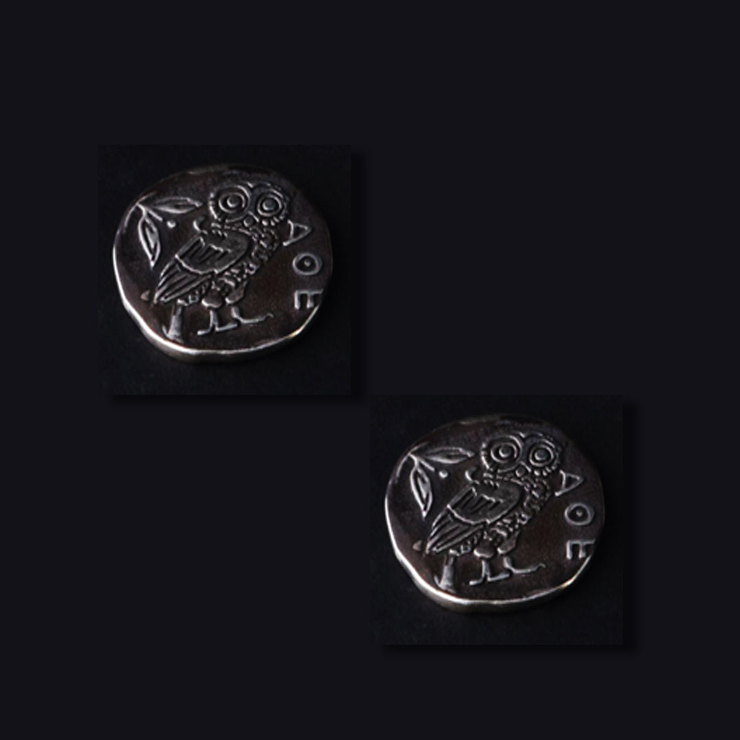 Pair of 925% silver coins. They represent the ancient Greek Drachma, with the effigy of the Owl.