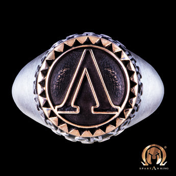 Spartan shield armor ring from legends linked to it designer Giuseppe Donato creates a linear ring with many details depicting the Spartan order shield. Engraved around the good Greek saying: Return on your shield or on it. Jewel forged in 925% silver and bronze.